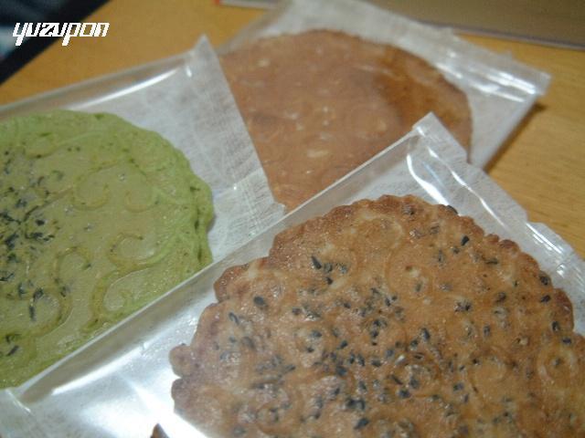 この「おせんべい」はね。先日主人の叔父さんが亡くなった時の通夜で頂いてきた。お菓子です。「ごま」「黒糖」「抹茶」