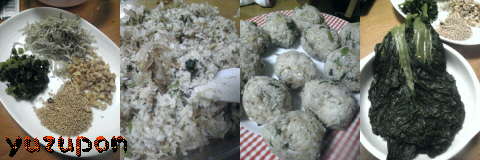 ころころ可愛いでしょう~cocoさんが作ってた「めはり寿司」を少しアレンジして作ってみました。「めはり寿司」って酢飯を使わないのに何故めはり寿司なんだろう??主人が「なんで?めはり寿司って言うの?」って言うんで「本当は、もっと大きくてね。そのおにぎりを食べるのに大きな口開けた時って目も大きくなるから、めはり寿司だって聞いたことがあるよー」って言ったら小さい「めはり寿司」なのに無理やりデカイ口を開けて小さな目を見開いて食べてた・・・変な奴だよ!yuzuponもやってみてって言うから調子に乗ってやってあげたら「おもろなーい目全然かわらんやん」仕方ないだろー元から多少は目が大きいしsatoponよりはかなり大きいから・・・