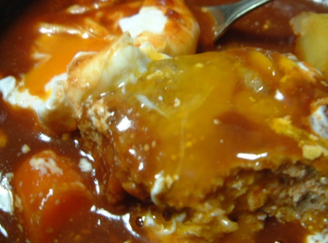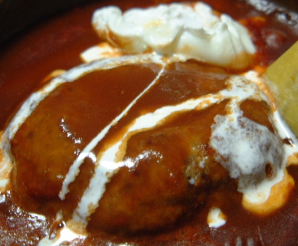 もうチョー手抜き!ハンバーグの種はFPで・・・ソースは業務スーパーで手に入れた「ドミソース」にトマトピューレを加えて少し酸味のあるソースにして、さっぱりと・・・ガロニには人参・さつま芋・ポーチドエッグ
