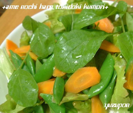 ベランダでワサワサ育った「ルッコラ」「サラダ菜」「スナップえんどう」と京都の借り農園で収穫してきた「にんじん」を使ってサラダを・・・