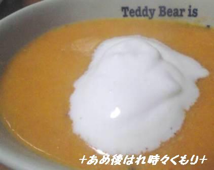 人参2本使ってスープを作ったよ~ずいぶん前に「cocoside-blog」のcocoさんが「にんじんポタージュ」作ってたのを見てから作りたかった~FPが無かったんで作れずにいたんだけどFPを購入したんで作ってみたよ~cocoさんの人参スープもっと色が綺麗だったような・・・牛乳入れすぎたか?熱々スープにホイップを浮かべてカプチーノ仕立てに主人も気に入ったみたいです。