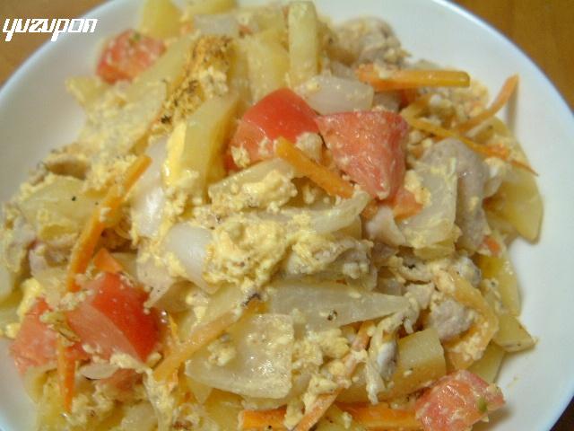 ドイツのじゃが芋サラダ・・・トマトも入れてみたよ~マヨネーズを入れた卵でとじてます。コレも主人すきなんだよね。まぁ何でも食べるから(笑)