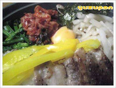 「豚バラ石焼ビビンバ」でした。ほうれん草にはゴマを和えてパプリカはそのまま大根は黒糖林檎酢に漬け込んでブロック豚バラをカットし塩胡椒で焼いてます。ソースは焼肉のタレに昆布柚子醤油・黒糖・お湯で溶いた西京味噌を混ぜて作りましたよー我が家では珍しくキムチ・・・年に1~2回買うかな?「辛い~」っと言いながらワーワー言って食べます(笑)2人共辛いのが苦手なもんで・・・昨日もビビンバに入れすぎて辛いを連呼していました。ほんまアホな2人ですわ!おこげも美味しいねー