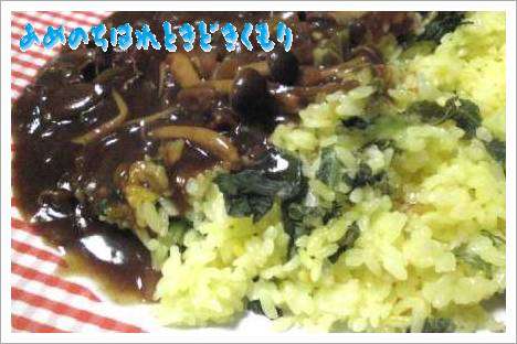 昨日の夕ご飯は「きのこのハヤシ」まぁ きのこって言ったって「ほんしめじ」しか入ってませんが・・・玉葱スライスの方が断然勝ってますぜ!おまけに牛肉では無く豚肉だし・・・ライスはサフランを入れて一緒にで「サフランライス」そこへ高菜漬を刻んで混ぜ込みましたよ・・・シャキシャキの食感がいいですよー