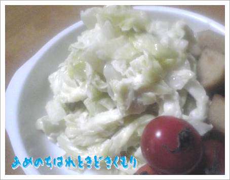 後はキャベツのコールスローサラダマヨネーズに黒糖林檎酢を混ぜて和えてます。プチトマトの後ろに見えてる物は黒糖林檎酢に漬かってた林檎です・・・無駄なくいただきます(ちょいスッパイけど)これ刻んでタルタルソースを作っても美味しいんだよ~しかし我が家って…ワンプレートに近いものが多いねー洗物が少なくて楽チンです(笑)