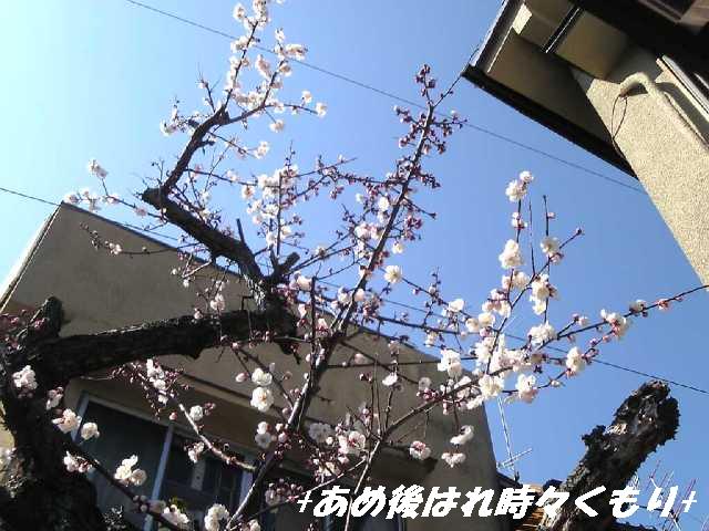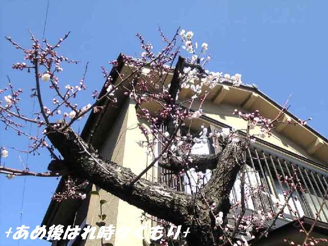 京都主人の実家玄関先にある老木「梅の木」もう根元少し上の辺は空木な箇所もあったりして添え木の杖を突く老木・・・毎年「咲くかな?」っと心配去年も咲いていたが数えるくらいしか咲かなくて、お義母さんも心配していた。今年は沢山花が咲いた去年咲かなかった分嬉しくて家族が何度も何度も見上げる・・・「お義父さん今年も咲いたよーそれもたくさん咲いたよ去年あまり咲かなくて、お義母さんが哀しんでたから今年お義父さんが沢山咲かせてくれたんやねー」思いながら空を見上げ青空のどこかから見ているかな?