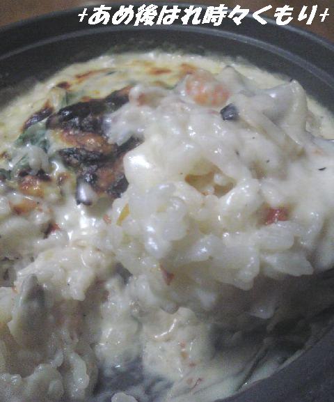 ライスは炊飯器に米とみじん切りにした人参とバターを入れてバターライスを少し硬めに炊き上げてますよーベシャメルソースにはチーズをたっぷり入れて熱々炊き上がったバターライスを器に入れて、その上から熱々トロトロベシャメルソースをかけ又チーズをトッピングしてオーブンのグリル機能で焼き上げました。そうそう収穫してきた小松菜を茹でて入れてます。ベシャメルソースの味付けは塩・胡椒隠し味に醤油を数滴・・・抜群に旨い!主人も大喜びでした。