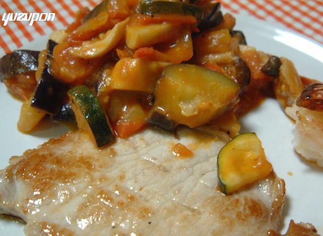 借り農園で収穫してきたトマトをつかって「カポナータ」を作って焼いたポークロースと一緒に食べましたよ・・・